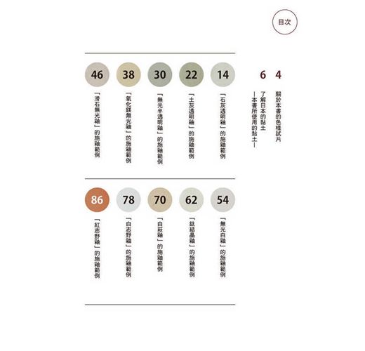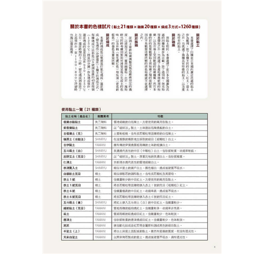 本書選擇了21種在日本國內廣泛流通的黏土作為範例。除了各種不同的白土、紅土、瓷土之外,也挑選了幾種具有特徵的黏土,以及產地特有的黏土。