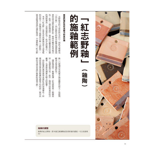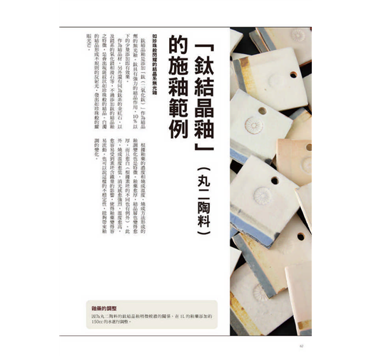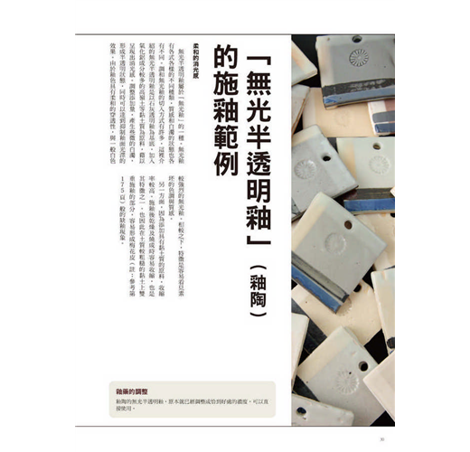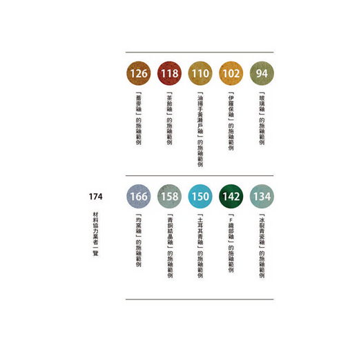 與黏土相同,本書選擇了在日本全國廣為流通的20種釉藥作為示範。除了透明釉、無光釉等基礎釉之外,也挑選了各產地傳統使用的釉藥,以及市場上受到歡迎的釉藥種類。然而本書的目的是要觀察黏土與釉藥之間的搭配性,因此不易觀察坏體狀態的深色釉藥就不在選擇之內。