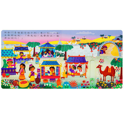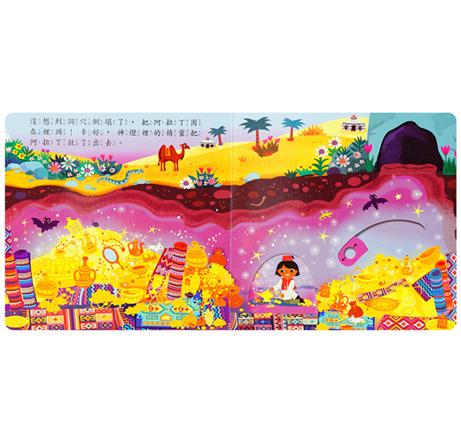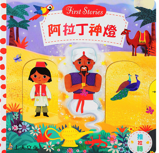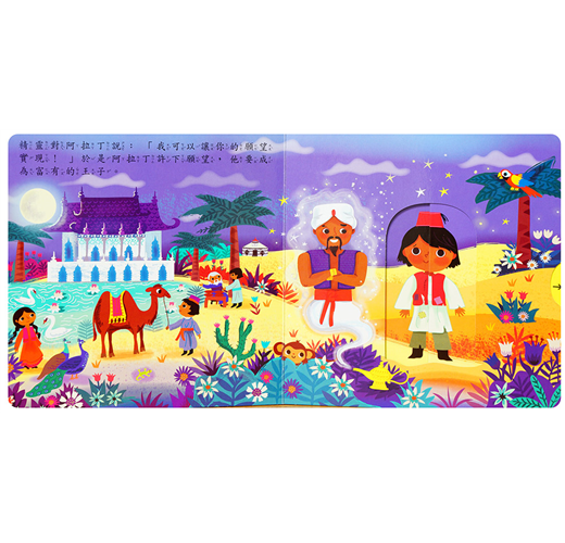 神燈裡的精靈把受困的阿拉丁救了出去, 精靈還讓阿拉丁的願望實現!可推可拉又可轉,阿拉丁的故事動起來!