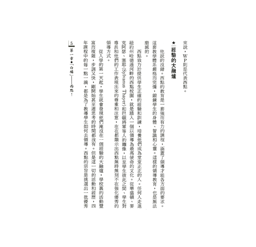 這是一本介紹領導的書,一本匯集了200年西點軍校經驗的領導書,而許多史上的名將都是出身於西點,這就表示西點所訓練的領導過程有著特殊之處。一向以培養最優秀的領導人才為己任的美國西點陸軍官校,自1802年創校以來,即建立了一套獨特的教學體系,不但為美國培養出無數傑出的軍事領導人才,更為世界上許多著名企業造就為數可觀的領導人。包括可口可樂、通用電力、杜邦化學等數十家大型金業的總裁,甚至首度登陸月球的三位太空人當中,就有兩位出身西點,成就早已超過哈佛商學院訓練出來的領導人才。