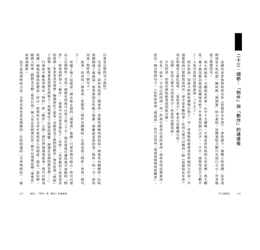 ,當然,這並不是說文章只要「動」不要「靜」。事實上,比較「靜」的文字也有它的功能,只是它不應該是文章的主角,而是某些關鍵時刻的特殊手法。我們要重新調整自己的預設值,先讓自己習慣用動詞思考,順手一寫都是滿滿的動詞,接下來再去學習怎麼用形容詞和副詞來增幅文字的效果。