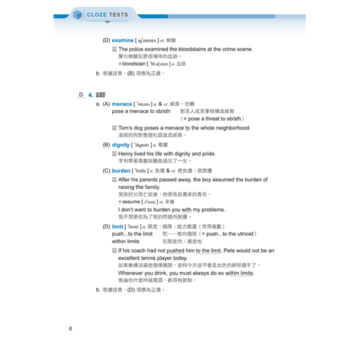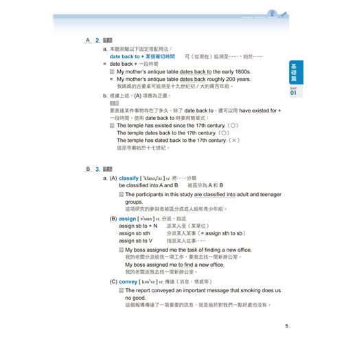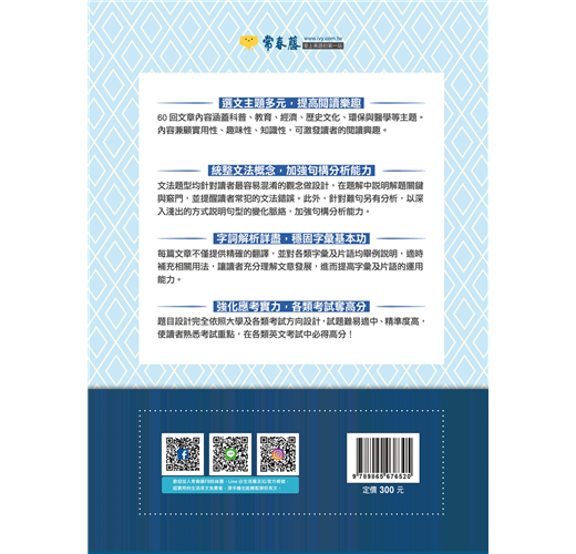 文法題型均針對讀者最容易混淆的觀念做設計,在題解中說明解題關鍵與竅門,並提醒讀者常犯的文法錯誤。此外,針對難句另有分析,以深入淺出的方式說明句型的變化脈絡,加強句構分析能力。