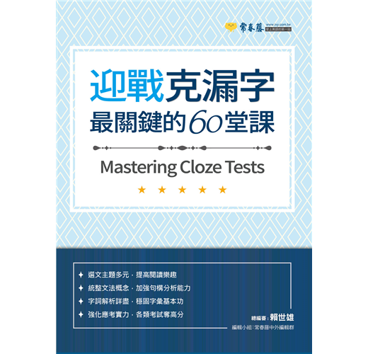 有鑑於此,常春藤英語集團動員中外編輯群,特別推出這本《迎戰克漏字:最關鍵的 60 堂課》,將學生常混淆的文法觀念、常見字詞用法以及其他考點一一納入,並輔以精準詳實的解析,以期學生在最短的時間內融會貫通。此外,本書的選文包羅萬象,主題涉及文化、經濟、教育、醫學、科普及環保,盼讀者在閱讀本書後能熟悉各類主題的特色,進而從容面對生活化、多樣化的考題。相信本書精心設計的題目及文章,不僅能幫助考生在克漏字題型上穩操勝券,對於整體的英文閱讀實力也有莫大的裨益。