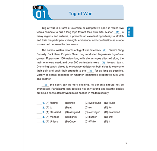 想要增進英文能力,閱讀是一條必經之路。在閱讀的過程中,學生得面對字彙、片語和句型等帶來的挑戰。為了評量學生的綜合閱讀能力,「克漏字」題型應運而生,並成為許多英文測驗中的項目之一。這種全方位的命題方式能將各類學習重點一網打盡,因此,若要在該項目拿高分,考生須熟悉常見的單字、搭配用法及文法句型,並了解文章的脈絡發展以及句與句之間的關係。唯有具備扎實的閱讀基本功方能在浩瀚的英文字海中游向高分的彼岸。