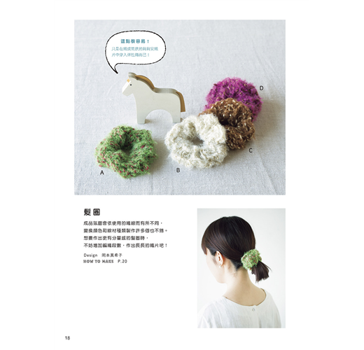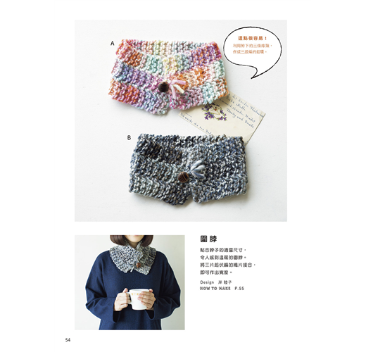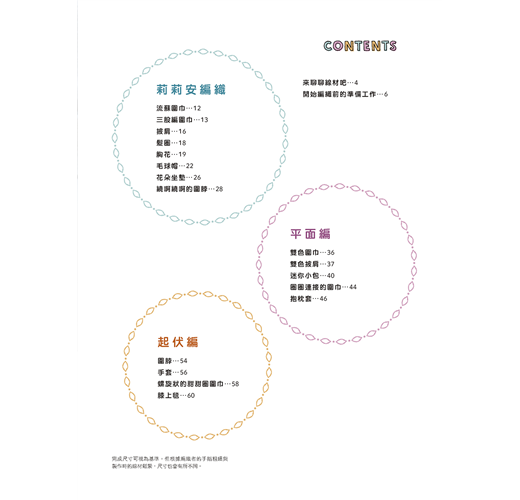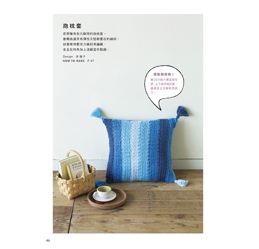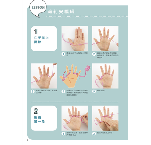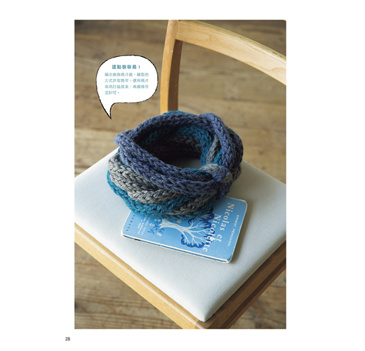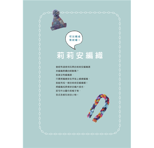 本書介紹的手指編織更是多達三大類!以織法分類為:莉莉安編織、平面編與起伏編。再加上運用拼接技法,讓織品不再侷限於常見的帽子、圍巾,還可以製作手提包、胸花等小物,甚至是抱枕套、膝上毯等中、大型織品。