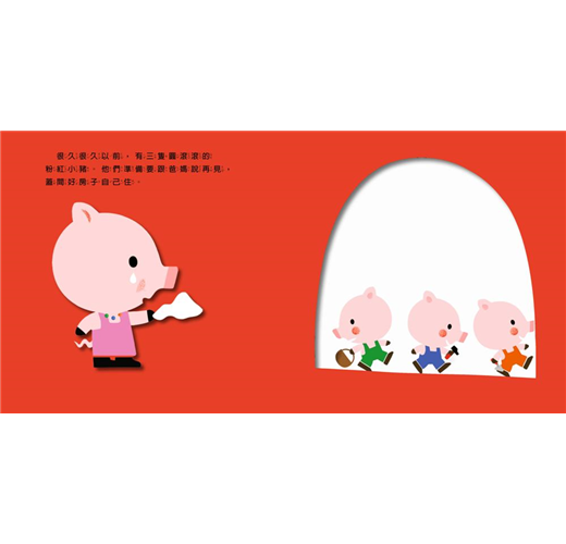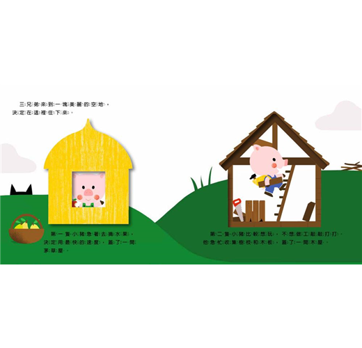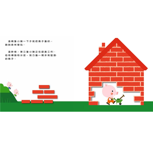 內容簡介: 很久以前有三隻小豬,他們要跟爸爸、媽媽道別,蓋自己的家來住。豬大哥決定用最快的速度,蓋一間茅草屋。豬二哥用收集來的樹枝蓋了一間木屋。豬小弟則決定用磚頭和水泥,蓋一間磚屋。當大野狼來襲,誰的房子能抵抗牠的攻擊?