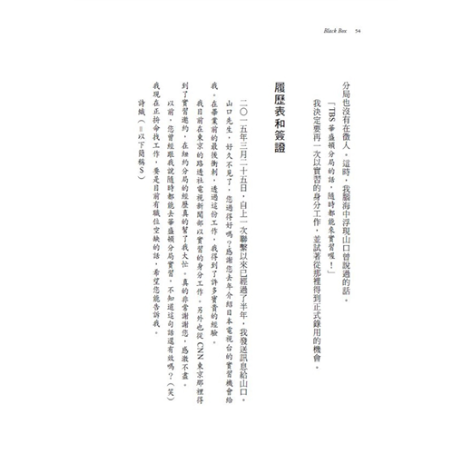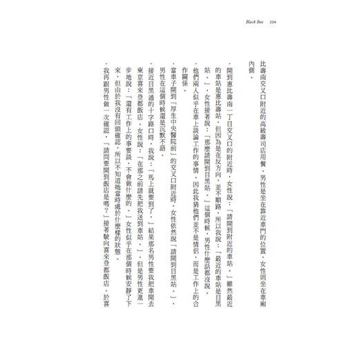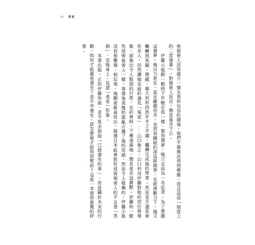 「之前明明看起來很精明的樣子,現在倒像是個困惑的孩子一樣,真可愛。」這是我被山口的發眼嚇得全身脫力倒坐在地時,他對我說的話。我要求他把貼身衣物還給我,結果他要我把內褲送給他當紀念。——《黑箱:性暴力受害者的真實告白》
