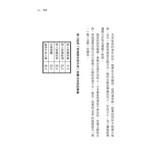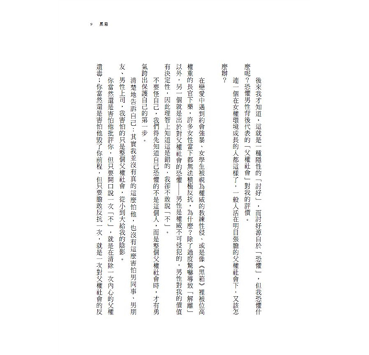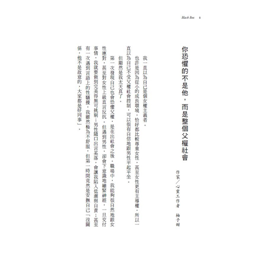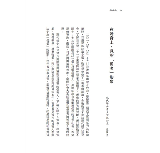 於是當這本《黑箱》的繁體中文版送到我手中時,我惦了惦書的重量,想著這實則是超過四年以上的長年抗爭,心頭激動。起初是一人獨自踏上的,慢慢走著,開始有人同行,接著原來真有比想像中更大的一群人,都歷經近似處境。閱讀字裡行間細節,同感強烈的情緒波動,有憤怒,有難受,而有更多的,也是女人迷必須持續推動改變的念頭——面向性別惡況,我們能選擇說出真實,建構更友善的性別環境。