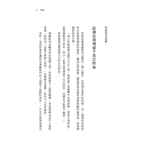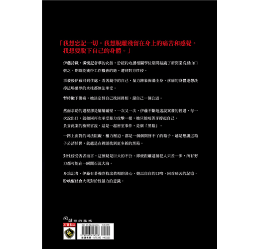 身為記者,她有著強烈找出真相的決心,回首痛苦記憶將只有當事人知曉的密室對話,及她在提出強姦被害與起訴狀後所遇到的司法及媒體高牆,全都記述在本書中。