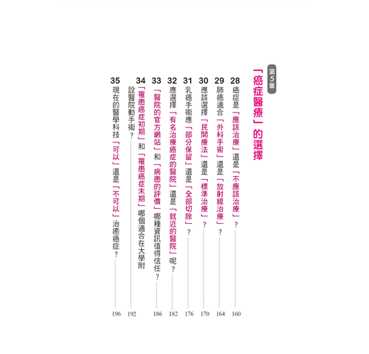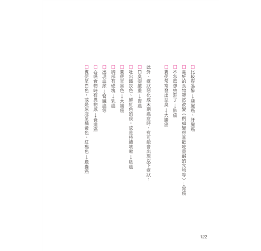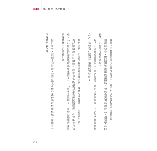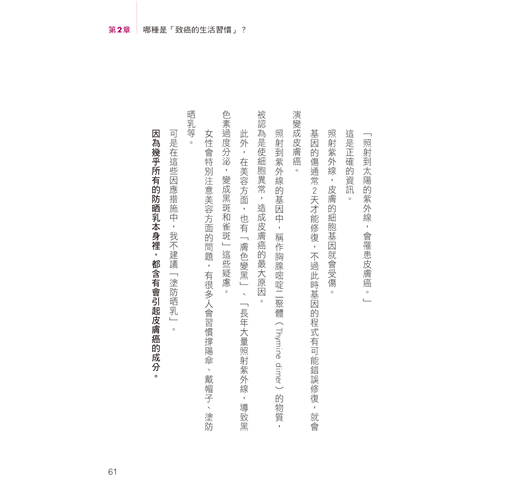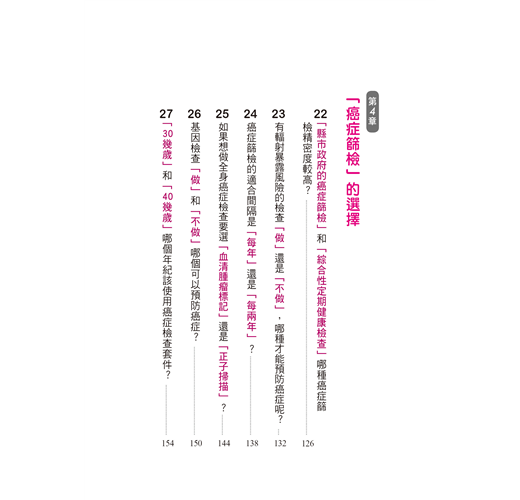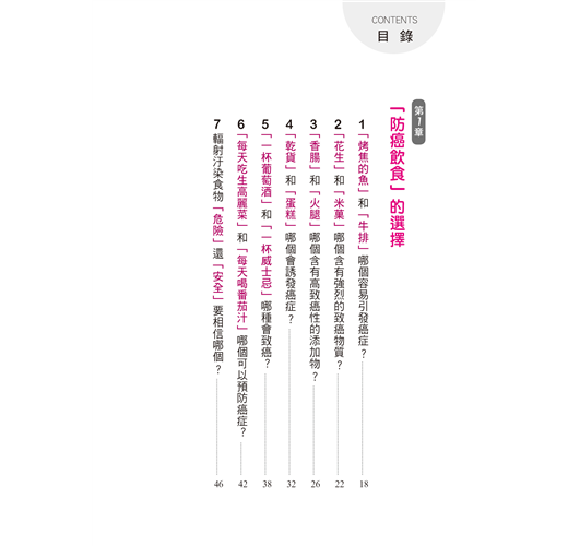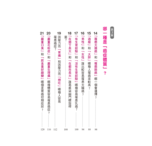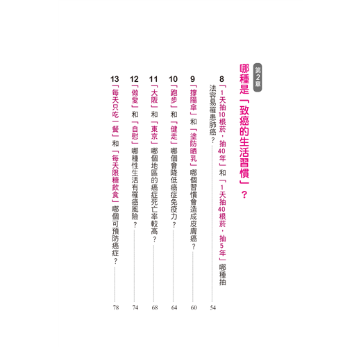 每一個項目,都是利用二擇一的提問方式呈現。首先,請各位先自己想想答案。接下來在閱讀當中,就會實際感受到你的常識和習慣有哪些誤區、了解罹癌風險有多高,並且該如何採取預防癌症的正確措施。