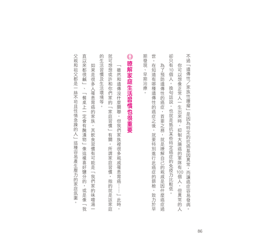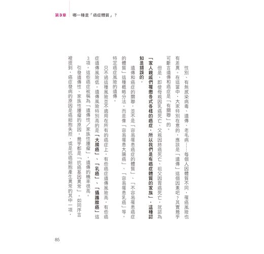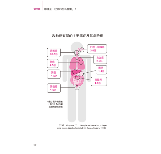 只是,不管把風險降到多低,癌細胞還是有可能會失去控制,有些人的先天體質使然,對於癌症產生的細胞抑制能力,原本就較低。這時就要靠「癌症篩檢」及「醫療」的相關正確知識來處理。因此,第4章會提供和「癌症篩檢」、第5章會提供和「醫療」有關的正確資訊。