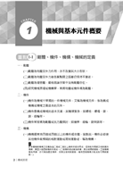★機械原理一網打盡★★主題架構分類統整★★精選重點一覽無遺★★豐富題庫完整精解★★主題架構分類統整★本書以主題區分,共分為21個主題,文中有重點整理,協助讀者梳理相關機械原理觀念,並於各主題末收錄相關試題,以供讀者練習並測驗自己的程度,從演練中學習解題技巧,強化基礎學習。★精選重點一覽無遺★由三民輔考權威名師依憑多年教學經驗戮力編寫而成,根據最新命題範圍全面修訂及編寫,篇章結構完整,內頁編排清晰,完整剖析概念及要點,輕鬆掌握考科重點所在,文字輔以圖形說明機械構造及元件,詳細剖析各項機械元件構造及原理,透視圖解,藉由圖形圖解方式,幫助讀者快速深入了解所有的機件特性!★豐富題庫完整精解★《機械原理大意》重點整理穿插試題演練,書末收錄105~108年考科試題,含鐵路、國營事業及各類特考,題題均有解析,節省考生額外搜羅考古題的時間,是檢驗自我實力的最佳幫手,可節省相當多的時間蒐集試題。準備機械原理,請跟老師這樣做鐵路特考近年來命題趨勢平均在本書第1至21章,讀者需要強化觀念與相關計算公式的熟記,必要時加以推導更能提升解題的能力。近年來在螺旋、鍵與銷、彈簧、軸承及連接裝置、帶輪、鏈輪、摩擦輪、液壓與氣壓傳動機構的命題最多,讀者需多加努力加強。