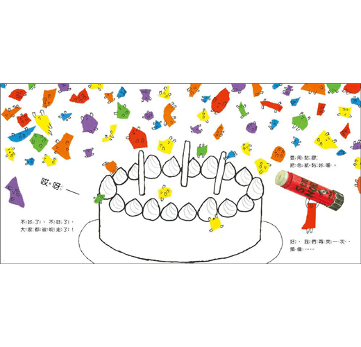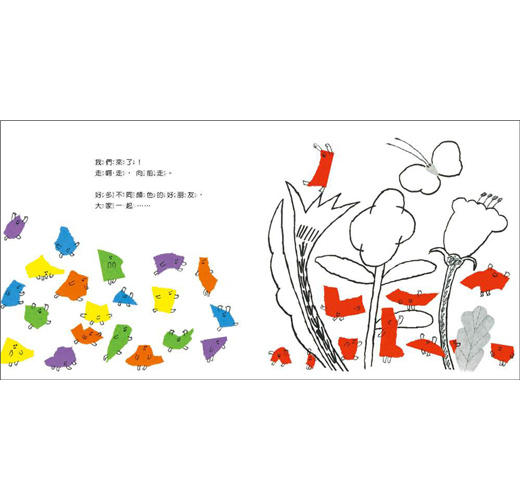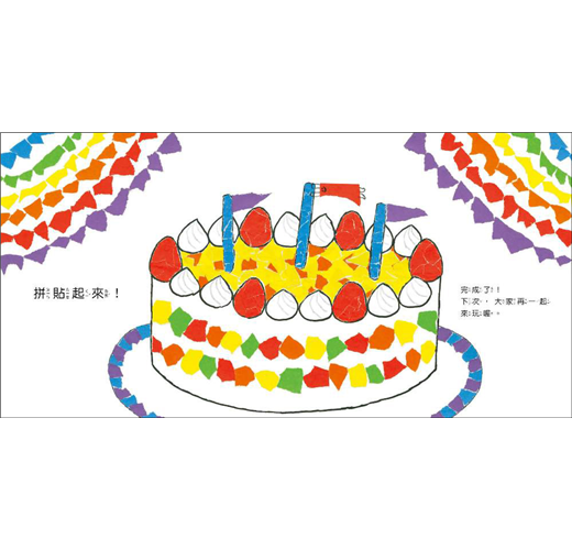 ◎這個故事把色紙擬人化,一個個可愛的小色塊湊在一起,在書頁上拼貼成美麗的圖畫,讀完故事讓人也好想玩玩看。「大家一起……拼貼起來!」跟著故事翻到下一頁,就能看到五顏六色的拼貼畫,小色紙們玩得好開心啊!──日本讀者西西