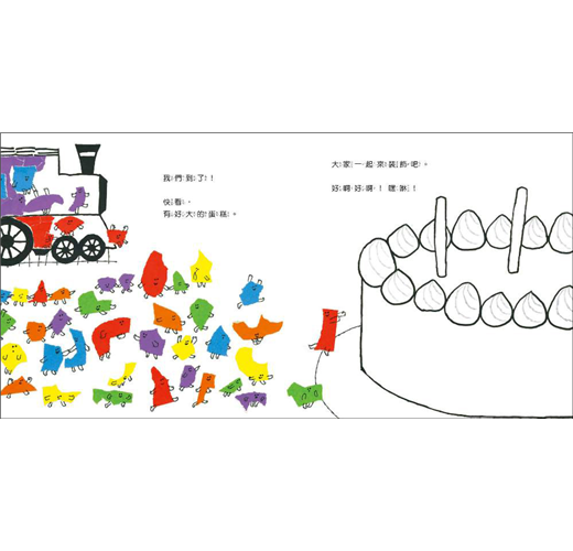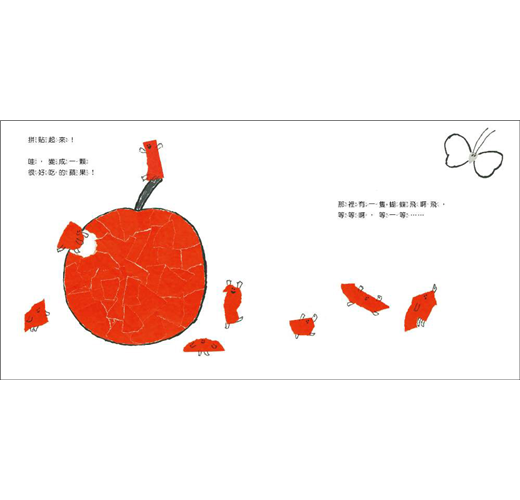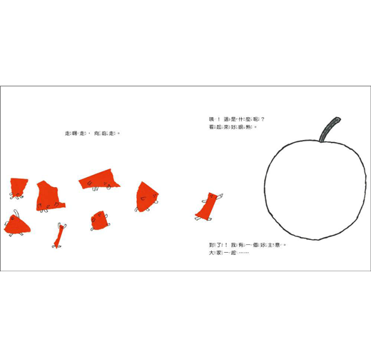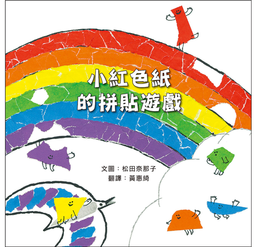 一本節奏輕快,好聽又好玩的遊戲繪本。在活力十足的小紅色紙的號召下,許多不同顏色的色紙集合,一下子變成蘋果,一下變成花園、火車和蛋糕…可愛極了!聽完故事,小孩一定也會忍不住想跟著玩拼貼遊戲。