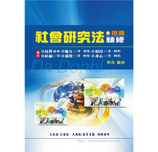 本書為大東海名師馬有針對高普考、地方特考及社福特考之考生所編撰。作者精心統整歷年精要考點,將本科概分為「研究法」與「統計」兩大部分,自社會研究法之基本概念理論,依序進入研究設計中所涉及之議題、研究方法與研究工具應用、結果分析與判讀等之專業領域,將社會研究法所涵蓋之學理、專有名詞、應用發現等加以闡釋,系統性歸納重點,輔以大量相關案例補充,結合時事議題,加深記憶點,關鍵核心顯而易見!
