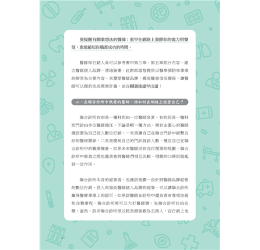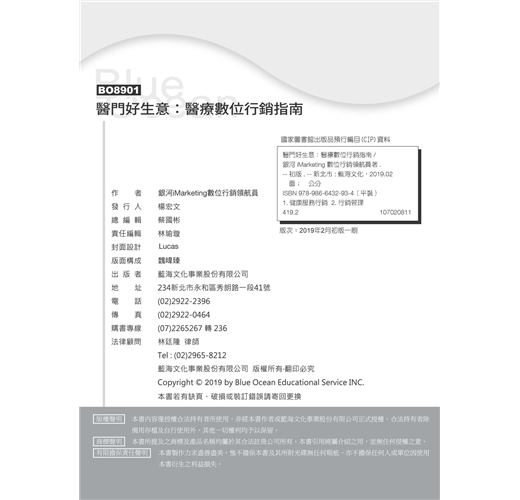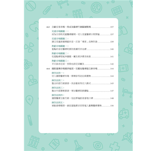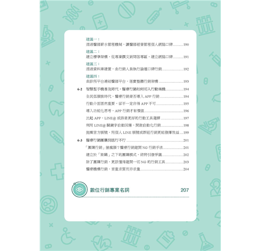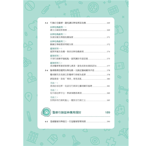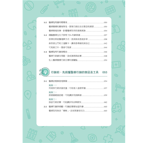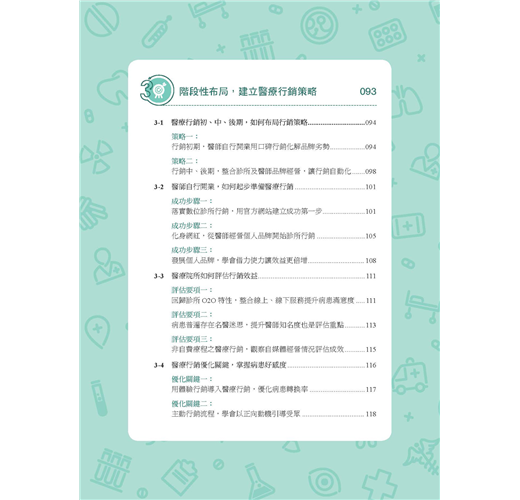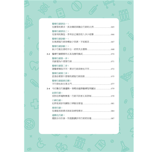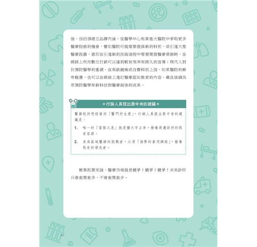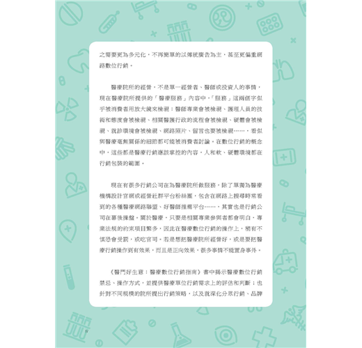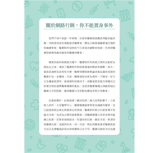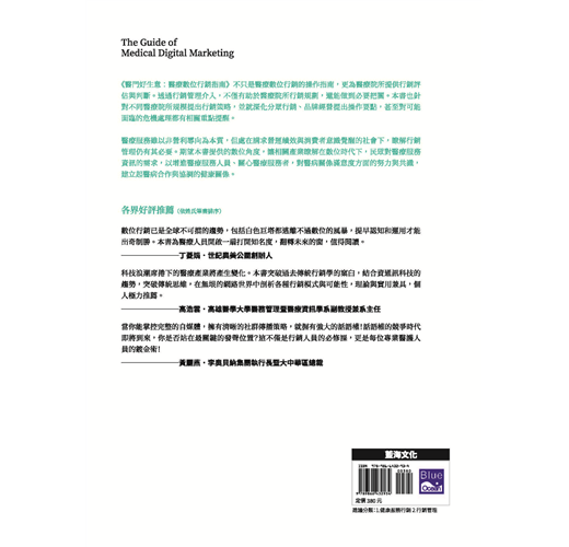 《醫門好生意:醫療數位行銷指南》不只是醫療數位行銷的操作指南,更為醫療院所提供行銷評估與判斷。透過行銷管理介入,不僅有助於醫療院所行銷規劃,還能做到必要把關。本書也針對不同醫療院所規模提出行銷策略,並就深化分眾行銷、品牌經營提出操作要點,甚至對可能面臨的危機處理都有相關重點提醒。