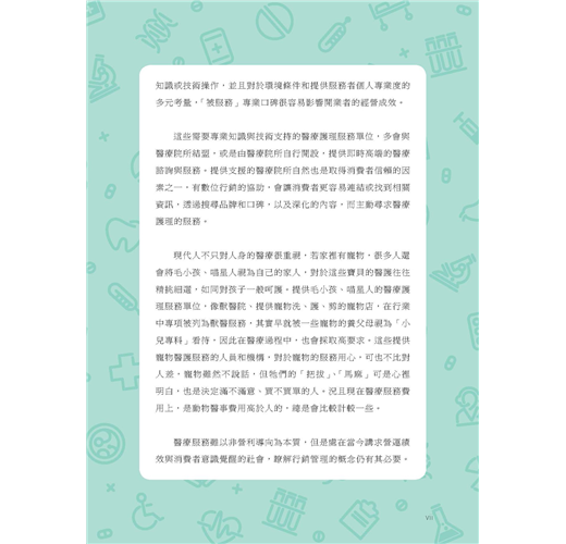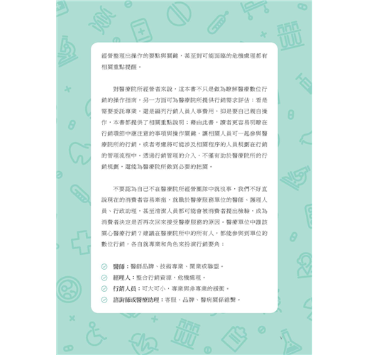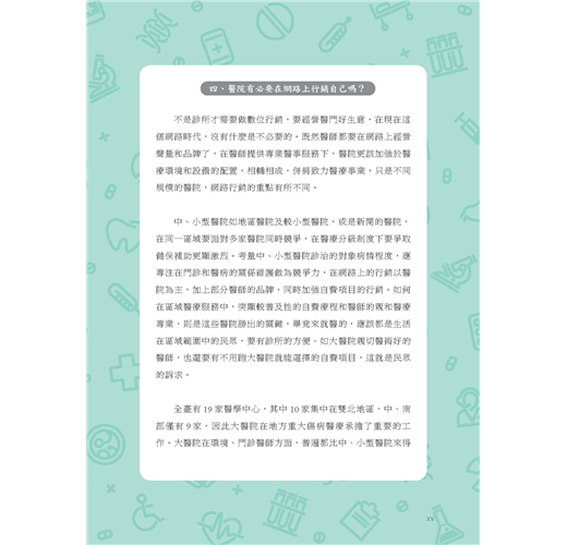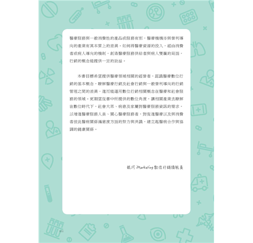 醫療服務雖以非營利導向為本質,但處在講求營運績效與消費者意識覺醒的社會下,瞭解行銷管理仍有其必要。期望本書提供的數位角度,讓相關產業瞭解在數位時代下,民眾對醫療服務資訊的需求,以增進醫療服務人員、關心醫療服務者,對醫病關係滿意度方面的努力與共識,建立起醫病合作與協調的健康關係。