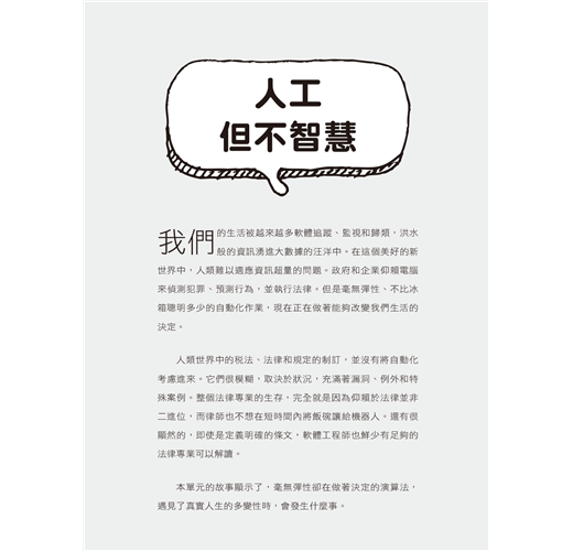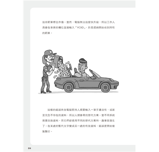 毫無疑問,我們的世界是靠電腦運行的。從你早晨那杯咖啡的價格到全球匯率,都是電腦說了算。全球各地的政府都在快速地數位化,工作也被演算法取代了。無所不在的自動化以及聰明的行銷手法,讓我們誤以為手機、電視甚至車子都有智慧。但是這些電腦系統都是人類創造的——立意良好,但會出錯、有偏見;聰明但健忘;有遠大的計畫但時間永遠不夠用的——人類。將一項工作數位化並不代表不會出錯,反而保證在錯誤發生時,影響的規模將會十分龐大。