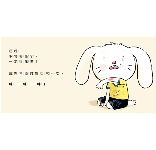 《誰來幫我擦藥藥?》讓孩子和書上的小兔子阿尼做互動,練習各種安慰、關心的話語和行動,了解什麼是同理心,懂得如何用體貼和親切,和他人善意互動。