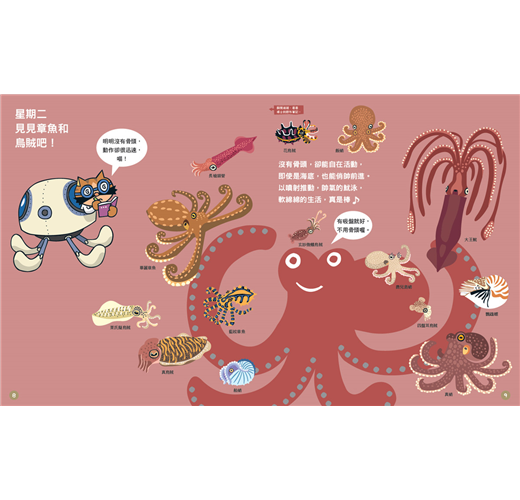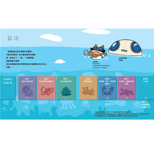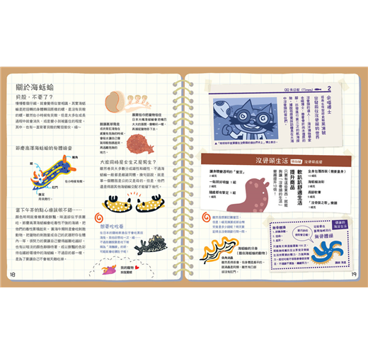 ․筆記內容是以余喵博士的角度觀看海洋生物們,作者用擬人化的角度、趣味的觀點,帶領讀者一起感受沒有骨頭的魅力!讓海洋中的無脊椎動物們,變成引領時尚的潮流!