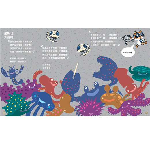 本書主角──余喵博士,因為骨折受傷而意識到了骨頭的重要性,因此,這次決定要來拜訪海洋中的無脊椎動物啦!作者用獨特趣味的視角,帶領讀者藉由余喵博士的筆記認識海底生物;加上可愛鮮明的插圖,揣摩每一個無脊椎動物的真實細節。看看沒有骨頭的牠們,是如何自在的在水中移動?牠們沒有骨頭,卻能舒服生活的祕密是什麼呢?快快翻開繪本,看看博士精彩的筆記內容吧!