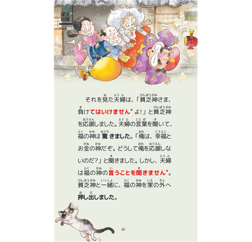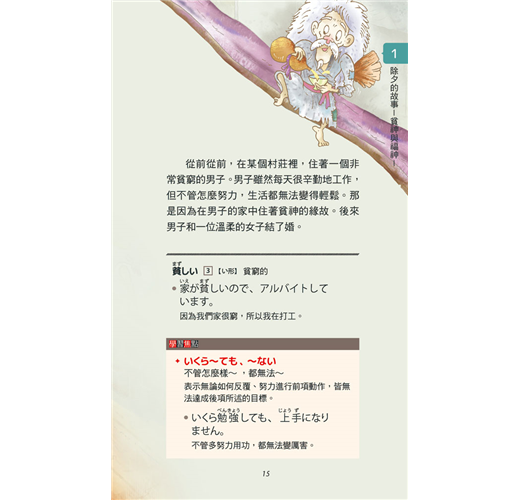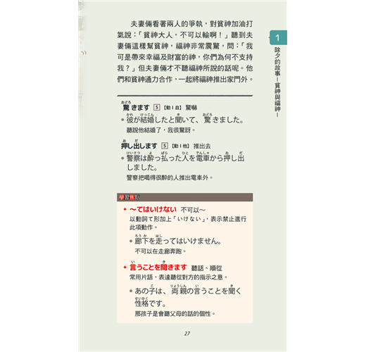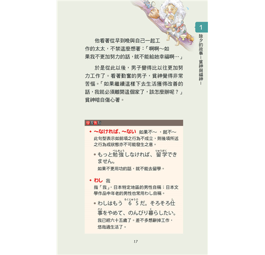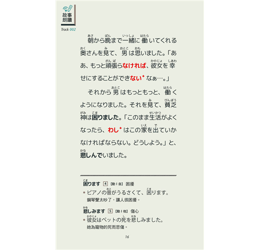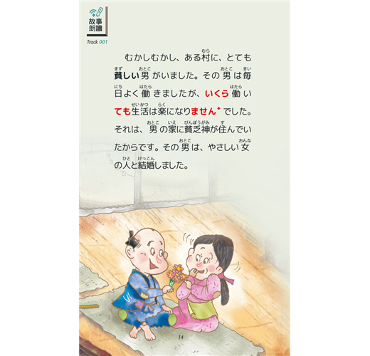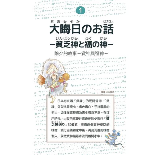 故事的改寫皆以N5~N3適用程度為範圍,希望能激發初學者或程度較淺的讀者們的閱讀動機,進而領略到閱讀故事的樂趣。我們將每一篇故事拆解成幾個段落,儘量放大字體加上假名,並以日中對照的同步翻譯。不僅更容易閱讀,也能讓讀者試著自己唸出故事來,並理解文意。文中所挑選出的重點單字和學習焦點,也隨附在每一個段落後面,配以簡易說明和例句,讀者更能學習應用。