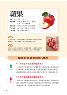 蘋果→果肉、果皮皆富含多酚與類黃酮,是天然的抗氧化物,能預防自由基傷害細胞;非水溶性膳食纖維能減少膽固醇的吸收。