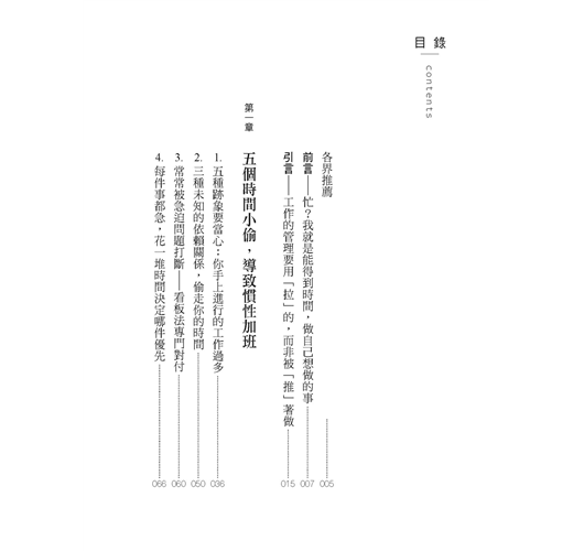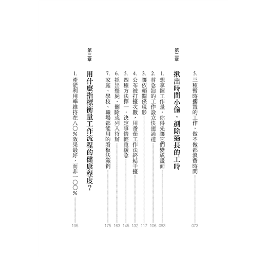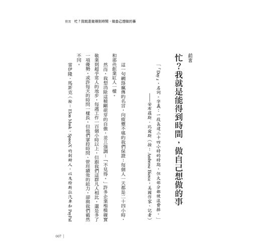 那我們該怎麼辦?我們既沒有無限的精力,也沒有龐大的幕僚支援,怎麼把一切該做的事情如期完成,過程中還不會犧牲品質與我們的心智?在一個歌頌生產力、講求一心多用的企業文化當中,該怎麼善用我們的時間與工作流(按: workflow,對工作流程及其各操作步驟之間業務規則的抽象、概括描述),使我們的努力與能量產生最大的影響力?最重要的是,我們如何在完成這些事情之後,還有時間生活?