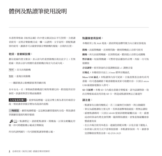 另特別搭配點讀筆工具,在書籍內每個重要段落、重要動機,均有內建音檔與譜例可隨時使用點讀筆觸碰聆聽,音檔內容由金鐘獎廣播主持人/本基金會副執行長呂岱衛親自解說並分解示範演奏,深入淺出幫助您梳理脈絡,讓您不再迷失於華格納層層疊疊的豐富筆韻中,不只聽熱鬧,更能聽出門道!