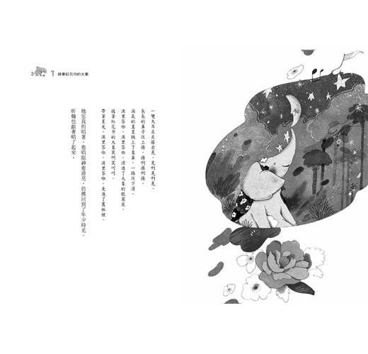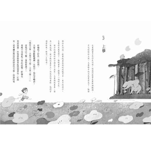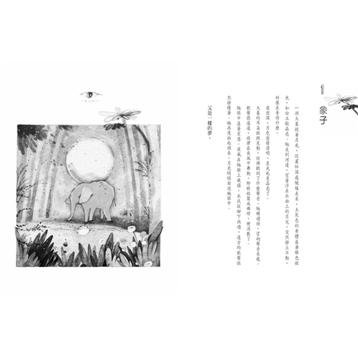 一頭大象披着月光,從叢林深處緩緩走來,土灰色的身體漾着銀色微光,如白玉般晶亮。牠走到河邊,望著浮在水面上的月兒,突然靜立不動,好像在等待什麼。