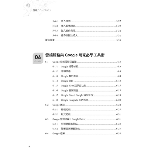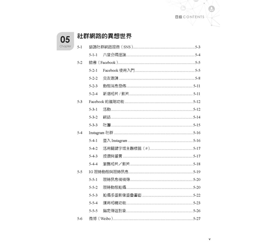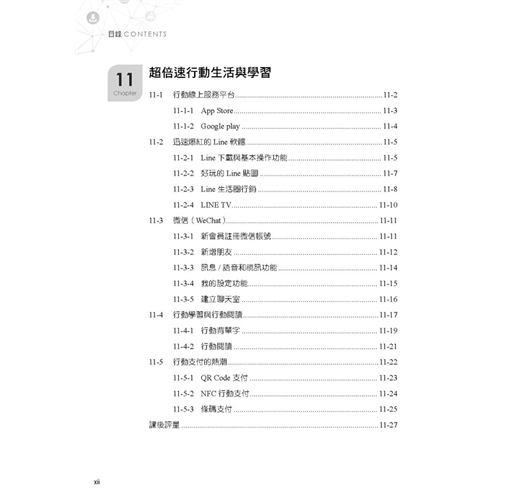 通訊網路入門與創新應用(雲端運算、物聯網、創客經濟、網路電視IPTV、智慧家電、體感科技、穿戴式裝置等)/全球資訊網與生活應用(BBS、部落格-Blog、P2P、FTP、RSS、維基等)/社群網路(FB、IG、微博等)/Google雲端服務與YouTube影音/電子商務、網路行銷、大數據/超倍速行動生活與學習(App、Google play、Line、微信、行動學習與行動閱讀、行動支付)等。