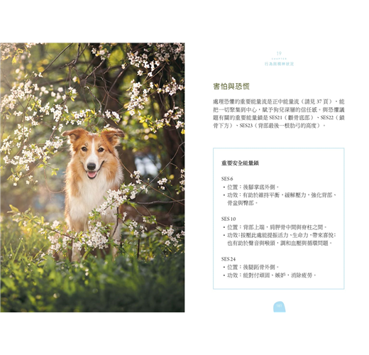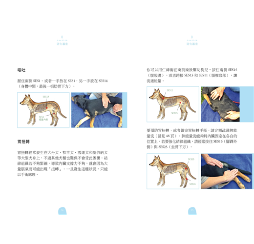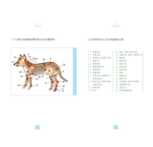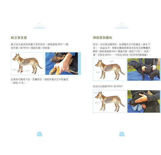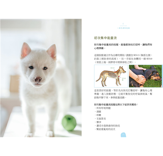 《超療癒!狗兒健康按握術---每天十分鐘,輕鬆按按保平安》,將狗兒全身分為二十六個能量點,透過簡單的按握,從一般能量的調和,到脾、胃、膀胱、頭部、呼吸道、心臟、消化器官、泌尿系統、生殖器官、皮膚、毛髮、大腦、神經系統、運動系統、免疫系統、腫瘤、水腫、傳染病、行為與精神狀況、受傷與緊急狀況等,都能夠施作。