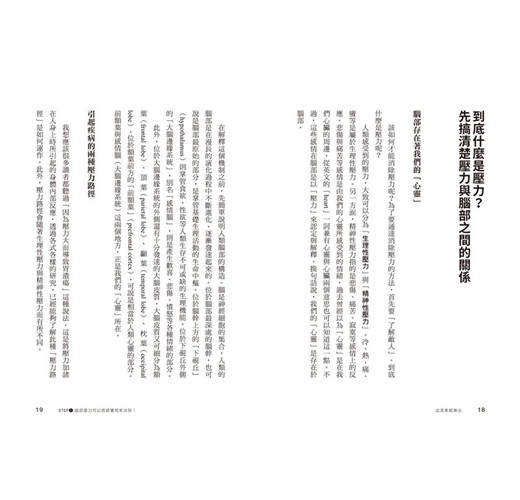 人活在世界上,就會面對各種接連不斷的壓力,而不管是為什麼而產生的壓力,其實都是透過腦部來感應的。我們得先了解腦的構造,和腦中能對抗壓力的因素,才能有效的開始踏出第一步。