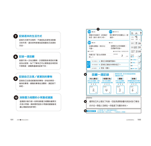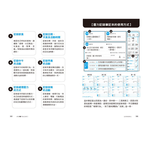 透過以一週為單位的記錄簿來記錄自己的生活吧,舉凡生活中的大小事和任何一個造成你壓力的來源,都可以在每天抽空用小小的五分鐘記錄下來,慢慢發現自己的壓力和解決它。