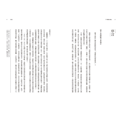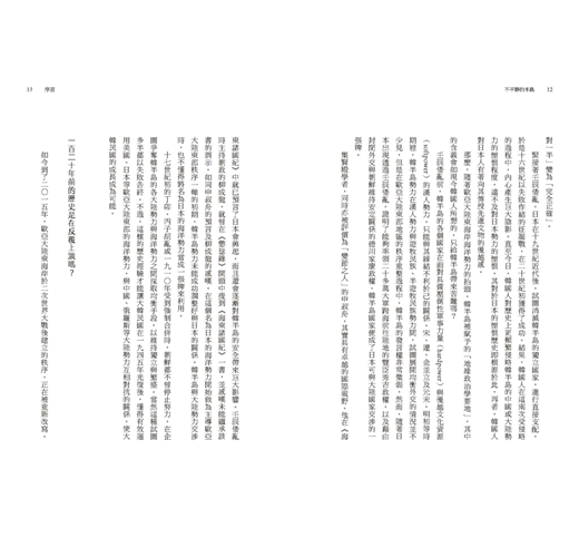 「本書從十六世紀日本的戰國時代開始,止於精確地將二十世紀分為兩半的韓國戰爭、韓日外交正常化及越南戰爭。雖無法對歷史做下明確結論,但是將在歐亞大陸東海岸這個廣闊地區、五百年來所發生的事情,快速地進行檢視,所以就算不夠細緻,也還是有整理之必要。」 —金時德《不平靜的半島:海洋與大陸勢力的五百年競逐》〈結語〉。