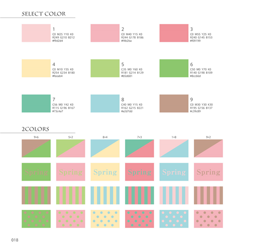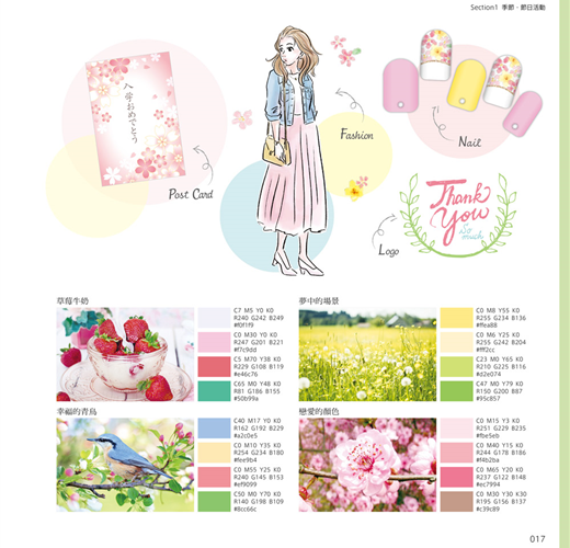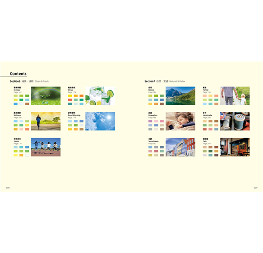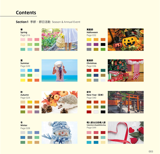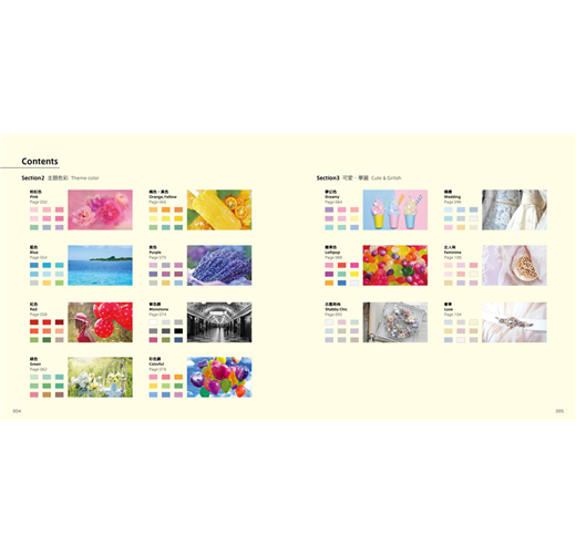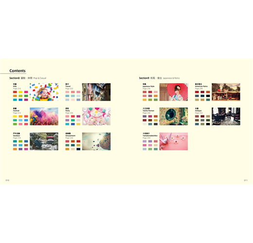 「季節‧節日活動」、「主題色彩」、「可愛‧華麗」、「現代‧時尚」、「高級‧優雅」、「清爽‧清新」、「自然‧安適」、「躍動‧休閒」與「和風‧復古」,以這9個配色意象為題的各式豐富照片,搭配插畫來舉例介紹。