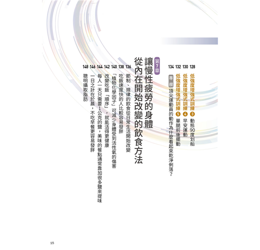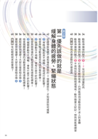 本書設計了4組戰勝疲勞的動態伸展操,包括基礎動態伸展操、結合有氧運動的強化版動態伸展操、增強肌力動態伸展操以及增強式動態伸展操,幫助排出累積在體內的疲勞物質,不但可以讓肌肉恢復柔軟,消除身體不適的症狀,擁有不疼痛、不僵硬的舒暢身體,精神也就會自然好起來。身體放鬆了、肌肉不緊繃了、睡眠就好了、疲倦感就掰了。