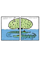 整本繪本採跨頁呈現,孩子可以看到好大的鱷魚和猴子,視覺效果也更加放大。河流也以許多不同線條方式表現,激發孩子不同的想像力。除了以厚厚的畫框,利用充滿飽和的色彩及生動的畫風,讓孩子能身歷其境這充滿機智的故事。