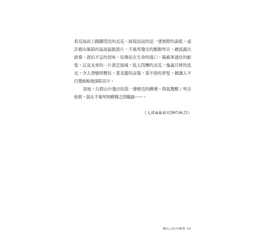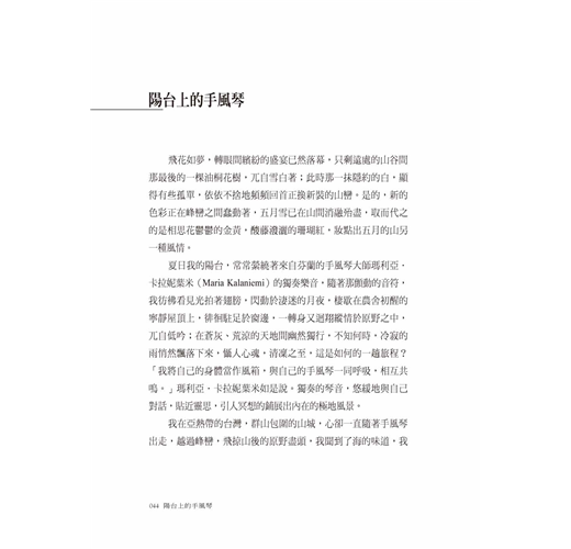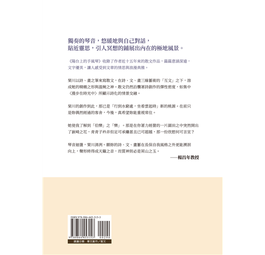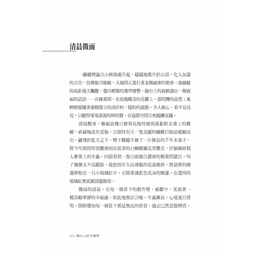 《陽台上的手風琴》收錄了作者近十五年來的散文作品,篇篇意涵深蘊,文字優美,讓人感受到文章的悠遠與浪漫典雅。