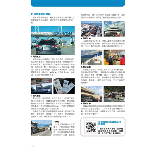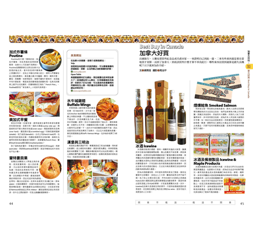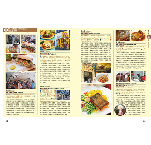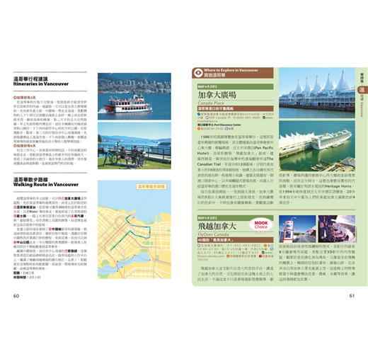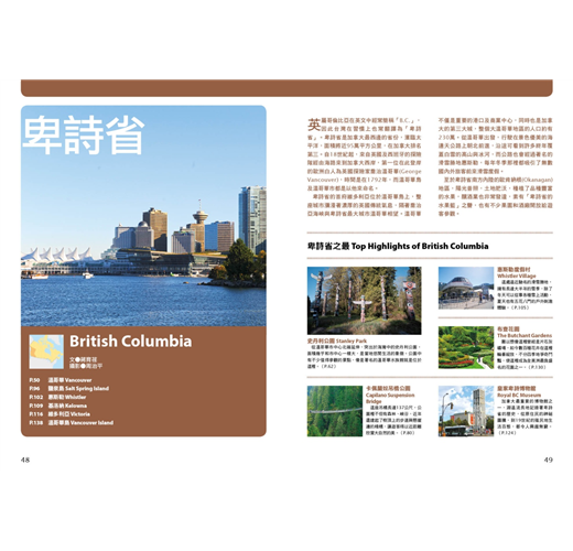 鹽泉島是近年來熱門的旅行目的地之一,本書不但介紹島上風光,也詳細解說如何搭乘BC Ferry抵達該處。而基隆拿也是炙手可熱的加拿大酒鄉,以出產冰酒聞名,隨著自駕旅遊的人口增加,前往基隆拿的人數也日益增漲,本書中則針對基隆拿的人氣酒莊,有特別報導。
