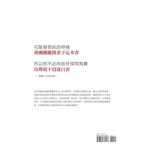 這本專書是為慶祝蕭蕭老師七十歲大壽而寫,從每篇文章細微之處,讀出大家的真情意,其實大家寫的都是對蕭蕭老師的感恩以及對他豐富的文學成就致敬。蕭蕭老師在七十歲之前的人生已經令人銘感在心,來自菲律賓、新加坡、湖北秭歸以及福建武夷山、故里福建漳州,乃至臺灣任教過的中學及大學的學生以及朋友們,都真誠寫出他們認識的蕭蕭老師,老師實是現代文壇與教育界令人敬佩的典範啊!