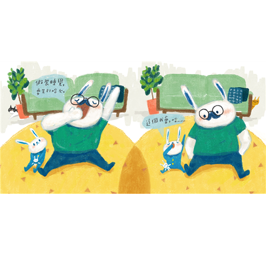 其實,若從教養觀點來看,一點都不「意外」喔。孩子不願睡覺有時是想撒嬌,爭取父母注意,這時很需要親子來點「睡前儀式」,譬如念晚安故事(可以念《假裝去睡覺》喔)、放輕柔的音樂或抱著小玩偶,目的都在培養孩子睡覺的情緒。而啵爸都做到了,而且做得還很「到位」,從假裝打哈欠、假裝躺在床上、假裝數羊、假裝打呼,雖然最後自己先睡著了,但也穩定了孩子的心情,營造適合入睡的氛圍。