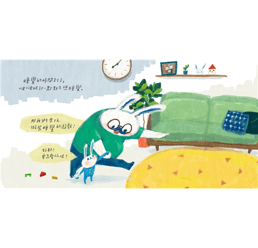 就像故事裡啵啵妮的爸爸(簡稱啵爸),接下了要哄啵啵妮上床睡覺的任務,一般來說,當孩子晚上精神太好,家長就開始煩憂,而啵爸卻老神在在,還說要陪孩子玩「假裝睡覺」的遊戲,結果兩人竟都「意外」睡著了。