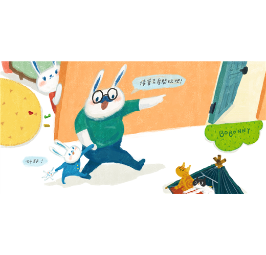 此時的孩子不僅是在行為上模仿扮演,思考上已很擅長虛構及想像,到了三、四歲階段,語言能力更加爆發的情況下,也常會蹦出意外又好笑的言詞。比如故事後半段,啵啵妮不僅能和啵爸一樣幻想羊在天上跳,也提出了更具有想像空間的要求,「爸爸,可以假裝讓羊到床上嗎?」或說「可以躺在羊身上嗎?」。你家的孩子也會這樣天馬行空,若你願意靜下來聽他說,實在好精采,更精采的是,你會看見孩子成長的路。