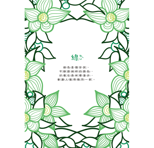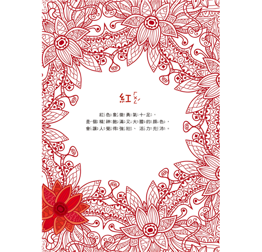 本書特色【8種顏色8個單元】利用不同顏色所帶來的情緒感受,分出8個顏色單元。打破以往單純黑白線條的著色本,像紅色象徵勇氣十足,給予精神飽滿的感覺;綠色讓人感覺好像在森林裡漫步一樣……,讓這八種色彩帶來不同的感官刺激吧!