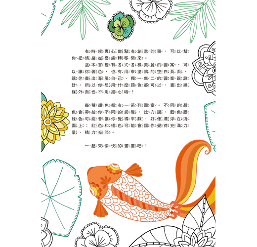這本書裡有各式各樣美麗的圖案,可以讓你著色,也有用來塗鴉的空白頁面,讓你畫出專屬自己、獨一無二的圖案跟設計。所以你想用什麼顏色都可以,畫出線條外面也不用擔心哦 !