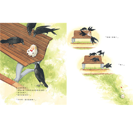 相較於上面歷經曲折的其他故事,這個故事顯得單純許多。他只遇到了烏鴉的攻擊,以及下雨。不過對小小孩而言,光是「分離」就夠痛苦了。一般而言,嬰兒大約在七、八個月開始,記憶力逐漸發展,能開始區辨主要照顧者與陌生人,有的嬰兒會開始對陌生人產生害怕或逃避的反應,當主要照顧者不在的時候便會有分離焦慮。所以這本書即便是與小小孩共讀,他們也能夠馬上理解小綿羊和主人分開的傷心及緊張不安。