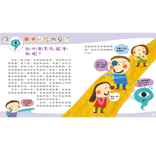 我們的身體有祕密,一起來尋找答案吧!我們的臉上為什麼要有眉毛、眼睛、鼻子和嘴巴?牙齒和舌頭又有哪些作用?當我們身體不舒服或心情不好的時候,為什麼會將這些情緒反應到臉上呢?趕緊到書中尋找答案吧!輕鬆有趣的內容,搭配搞笑的對話和插圖,讓我們更了解並珍惜自已的身體。