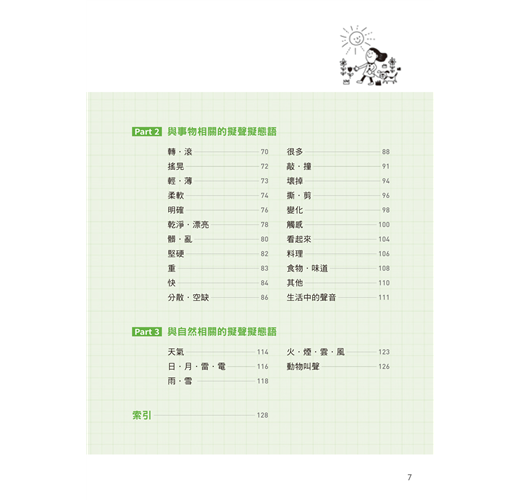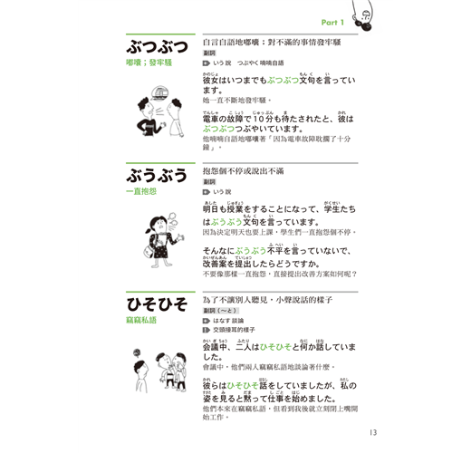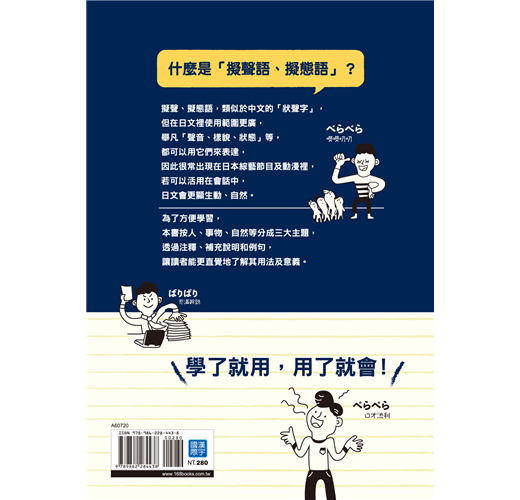 為了方便學習,本書分成人、事物、自然三大主題。透過解釋和補充說明,讓讀者能更直覺地了解其意義。另提供精心設計的例句,以便讀者能更精確地了解該「擬聲語.擬態語」所代表的感覺,並順利實際應用在句子中。因此比起認真看中文解釋,建議更仔細地閱讀日文例句。有些難以用語言表達出來的感覺,相信可以透過例句來意會...