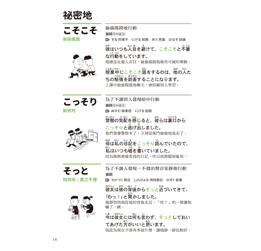 為了方便學習,本書分成人、事物、自然三大主題。透過解釋和補充說明,讓讀者能更直覺地了解其意義。另提供精心設計的例句,以便讀者能更精確地了解該「擬聲語.擬態語」所代表的感覺,並順利實際應用在句子中。因此比起認真看中文解釋,建議更仔細地閱讀日文例句。有些難以用語言表達出來的感覺,相信可以透過例句來意會。